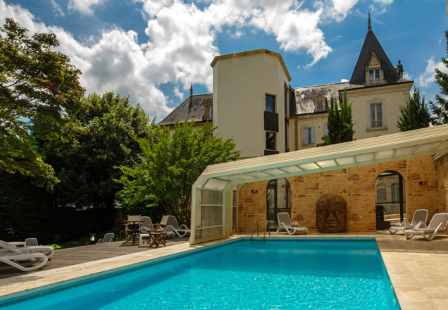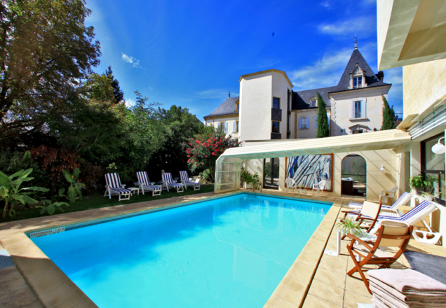 In the city center, a haven of peace set in a green park. Outdoor swimming pool, covered and heated in winter, jacuzzi, spa, patio with fireplace area, bar, piano, fitness room.